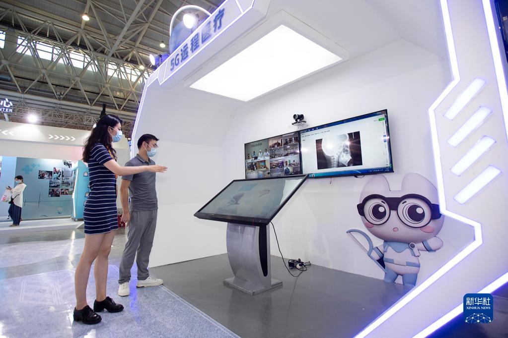 8月5日,在2022年世界大健康博覽會上,觀眾在武漢大學口腔醫院展廳了解5G遠程醫療。