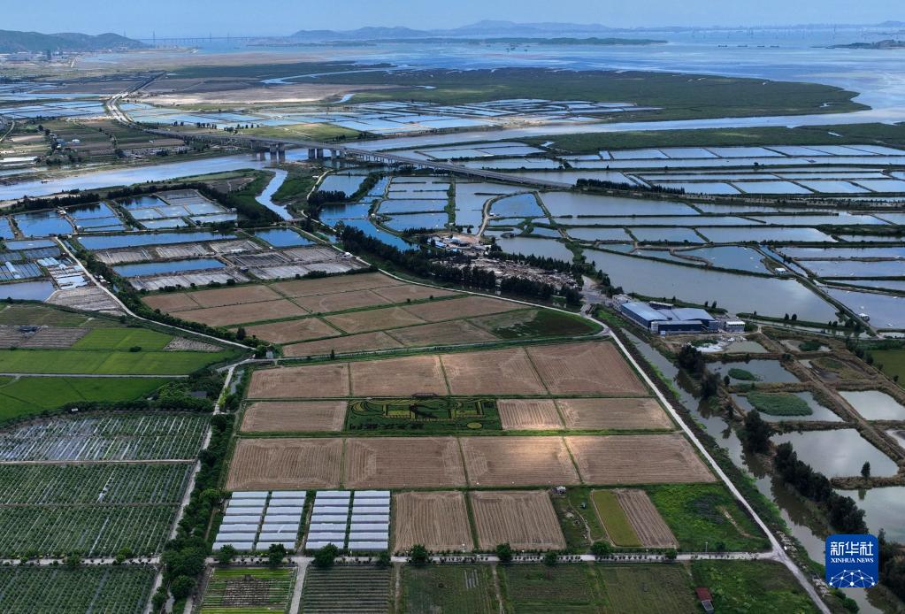 這是位于福建福清市的三華農業藝術稻田和周邊的灘涂養殖田(8月4日攝,無人機照片)