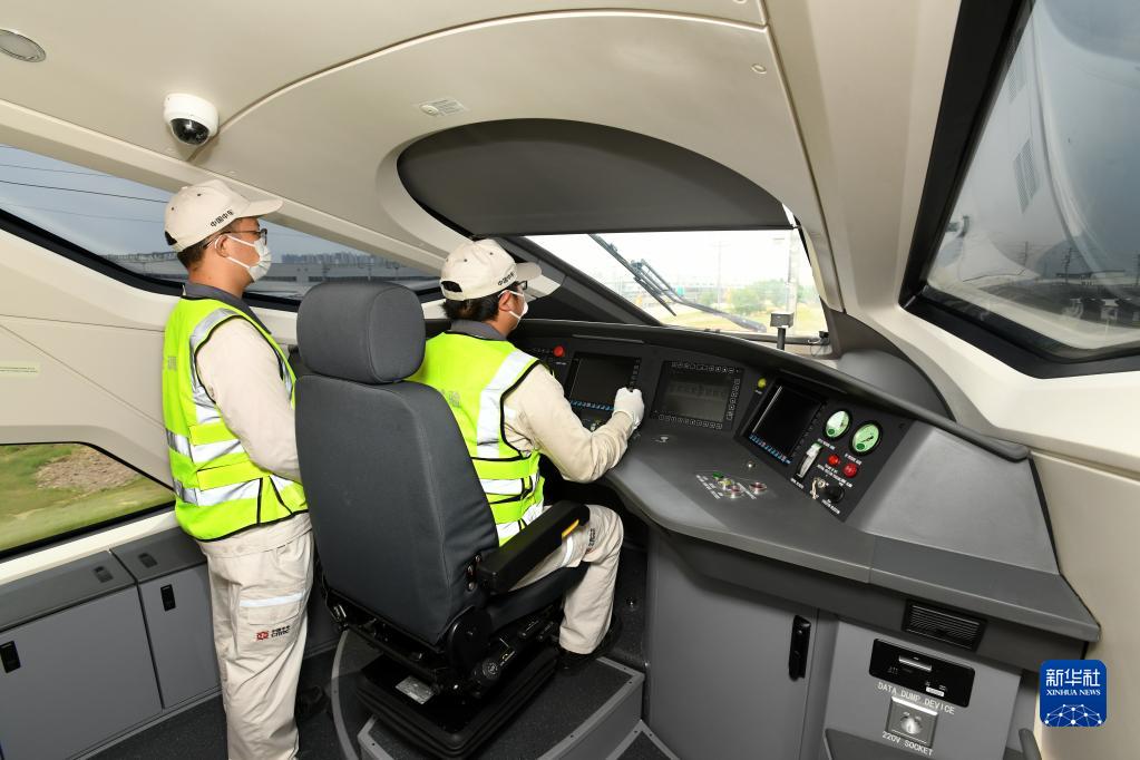 8月5日,工程人員駕駛雅萬高鐵高速動車組行駛在位于山東省青島市的中車四方股份公司環形試驗線上。