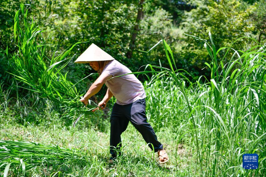 8月3日,貴州省臺江縣臺盤鄉棉花村村民在割草,準備給螞蚱投食。