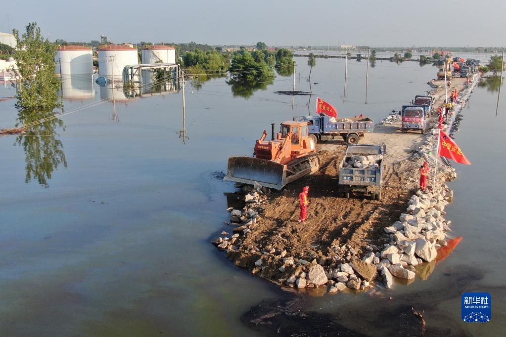 8月5日,搶險人員在潰口處進行封堵作業(無人機照片)。