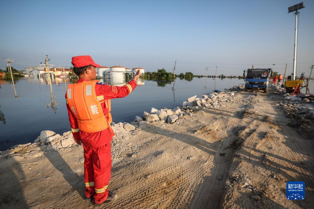 8月5日,中國安能集團搶險人員指揮運送搶險物料的車輛前往潰口進行封堵作業。