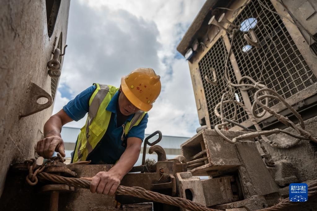 8月4日,高黎貢山隧道施工人員在施工現場檢查軌道車連接處。
