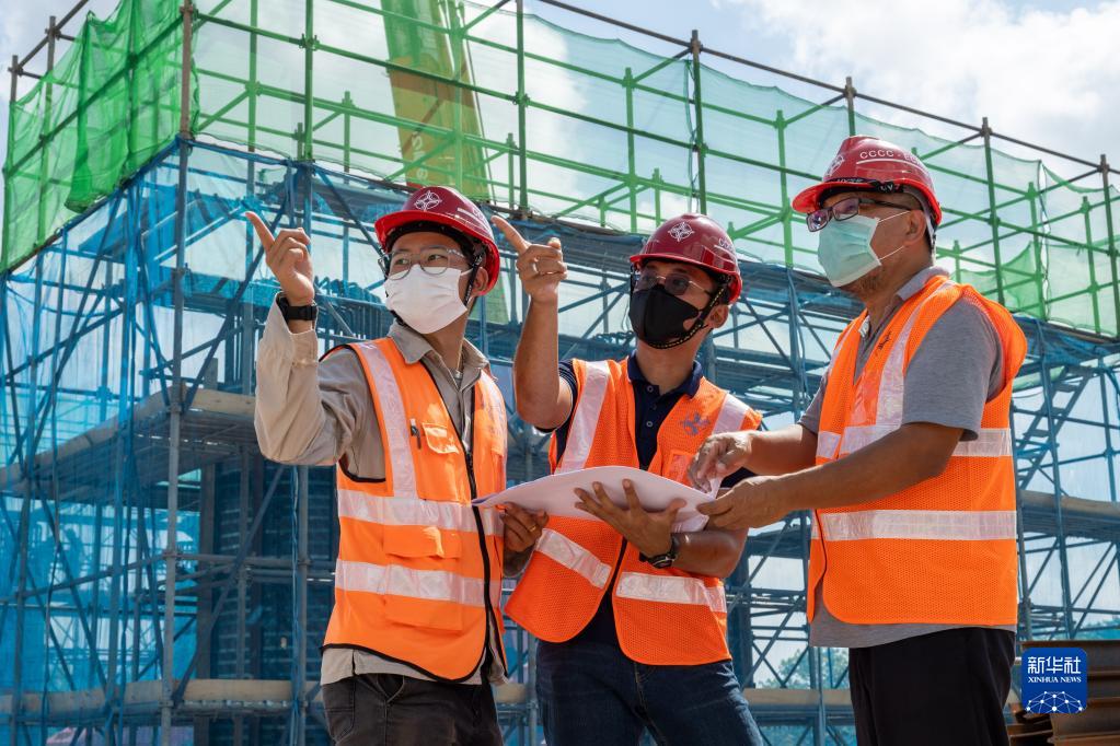 7月25日,西亞赫明(中)在位于馬來西亞彭亨州的馬東鐵項目六分部施工現場工作。