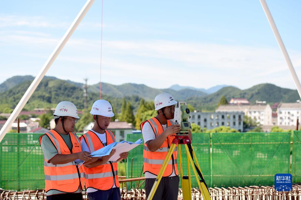 8月6日,測量人員在中鐵十一局池黃鐵路墩上特大橋系桿拱施工現場對拱體進行數據監測。
