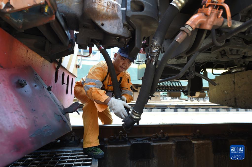 8月5日,合肥火車站運轉車間調車長李健在連接調車機車與車輛制動軟管,對列車進行編組。
