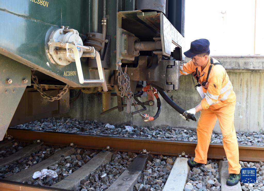 8月5日,合肥火車站運轉車間調車長李健在調試車輛制動軟管,準備對列車進行編組。