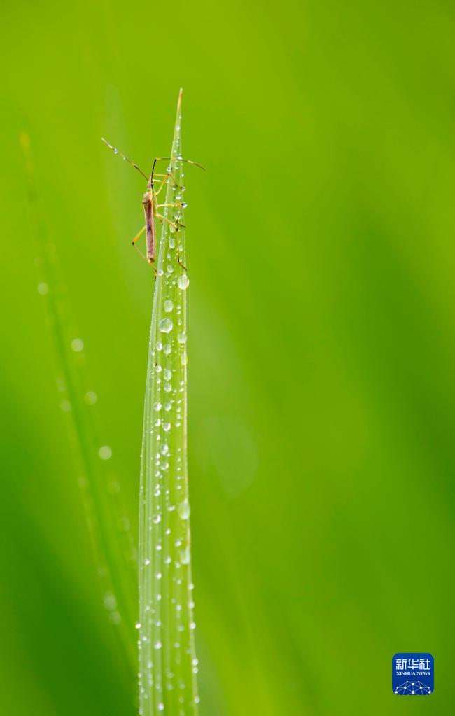 7月31日,在貴州省黔東南苗族侗族自治州從江縣,一只昆蟲停留在稻葉上。