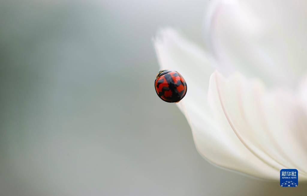 7月28日,在貴州省黔東南苗族侗族自治州丹寨縣郊外,一只瓢蟲在花葉上爬行。