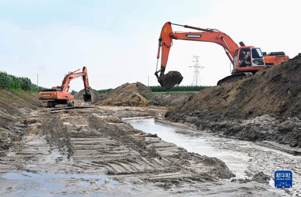 8月5日,工人在昌黎縣新集鎮境內的引灤河水灌渠清淤現場施工。