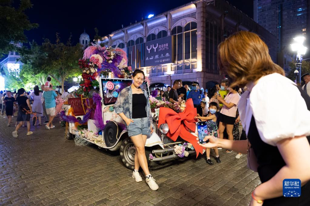 8月5日,在哈爾濱市中央大街,市民在花車前留影。