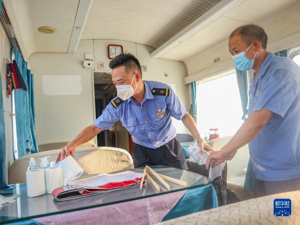 8月5日,在重慶西客車整備所,守車車長丁璐(左)和庫內保潔員對次日列車低耗品進行檢查確認。
