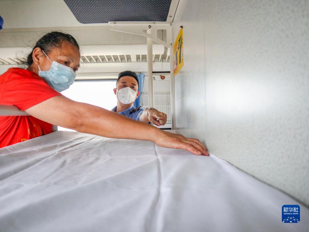 8月5日,在重慶西客車整備所,守車車長丁璐(右)督促庫內保潔員對全列臥具進行更換。