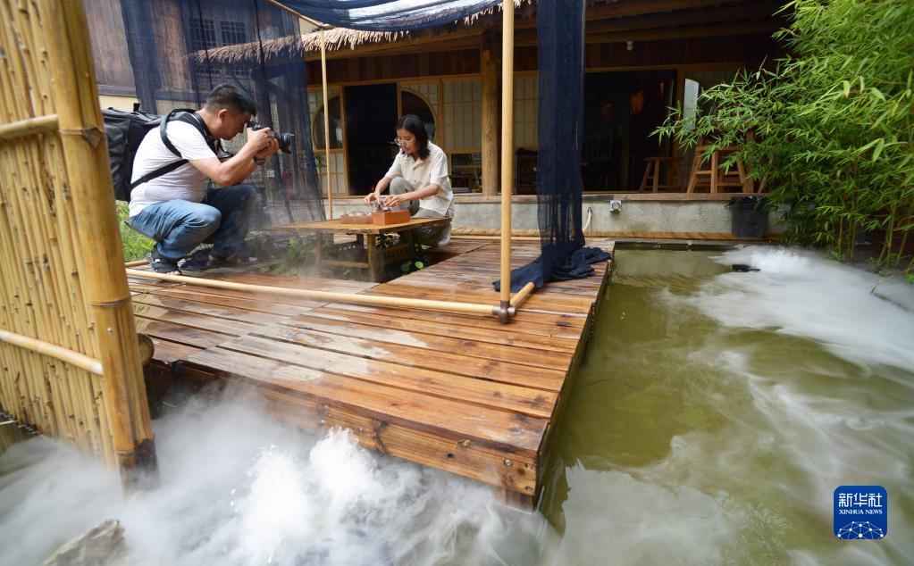 8月6日,游客在貴陽市花溪區石板鎮鎮山村“鎮山國際影像周”影展上拍照。