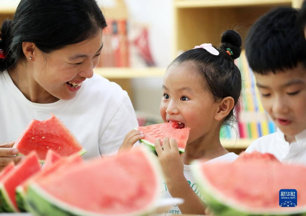 8月6日,山東省臨沂市郯城縣郯城街道龍泉社區居民與孩子一起吃西瓜“啃秋”。