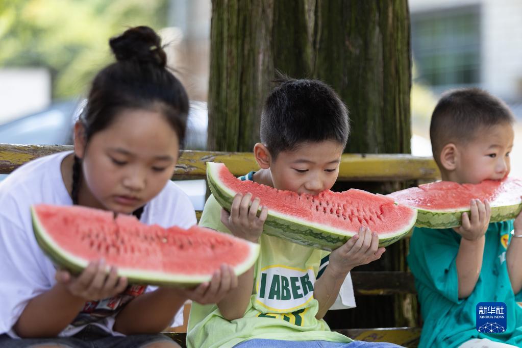 8月6日,在浙江省湖州市長興縣和平鎮琛磧村,孩子們在吃西瓜“啃秋”。