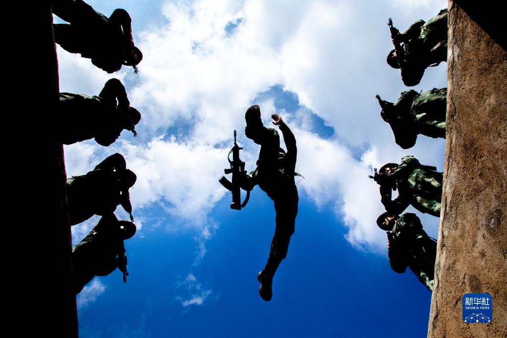 8月1日,武警廣西總隊玉林支隊某部不畏高溫練兵備戰,特戰隊員攜槍通過壕溝。八一建軍節,解放軍和武警部隊官兵在各自戰位上,以軍人特有的方式慶祝中國人民解放軍建軍95周年。