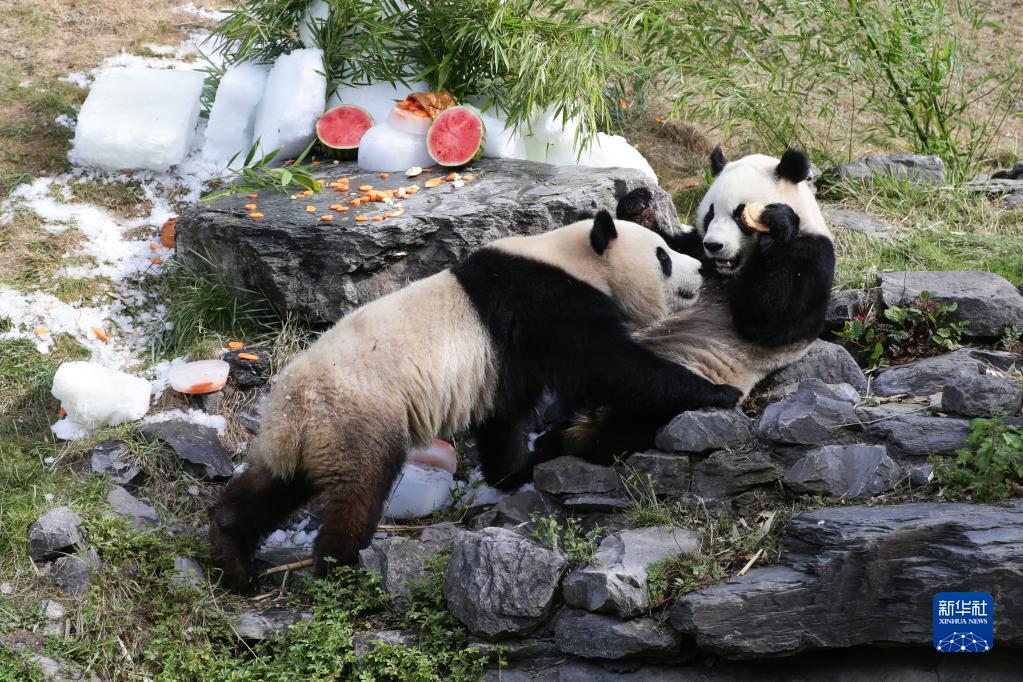 8月6日,在比利時布呂熱萊特的天堂動物園,大熊貓“寶弟”(左)、“寶妹”享用“生日大餐”。