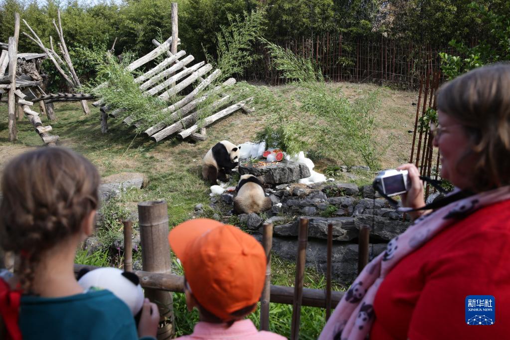 8月6日,在比利時布呂熱萊特的天堂動物園,觀眾觀看大熊貓“寶弟”(左)、“寶妹”享用“生日大餐”。