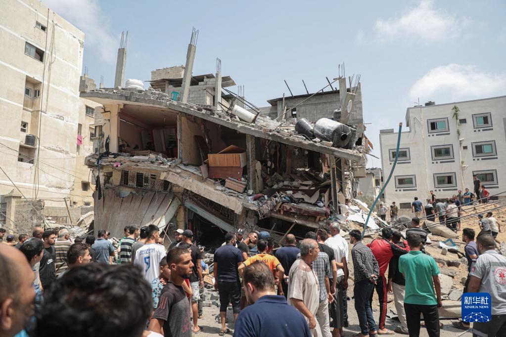 8月6日,加沙城遭遇空襲后,人們查看損毀的樓房。
