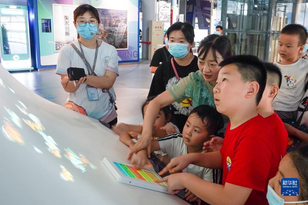 小朋友們和家人一起在南京科技館參觀(8月6日攝)。