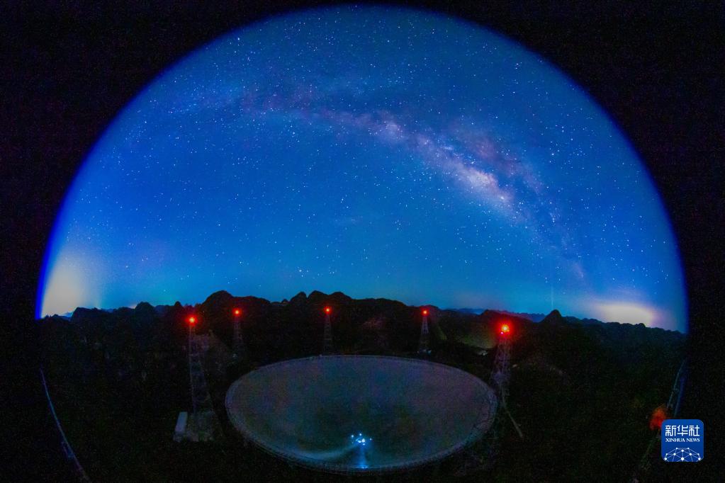 銀河下的“中國天眼”全景(2022年7月24日維護保養期間魚眼鏡頭拍攝)。