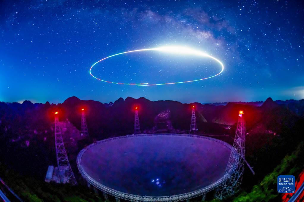 銀河下的“中國天眼”全景(無人機光繪照片,2022年7月24日維護保養期間拍攝)。