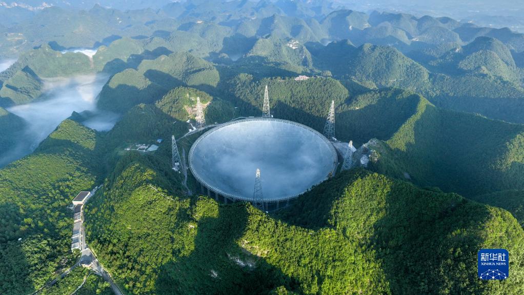 晨曦中的“中國天眼”全景(無人機照片,2022年7月25日維護保養期間拍攝)。