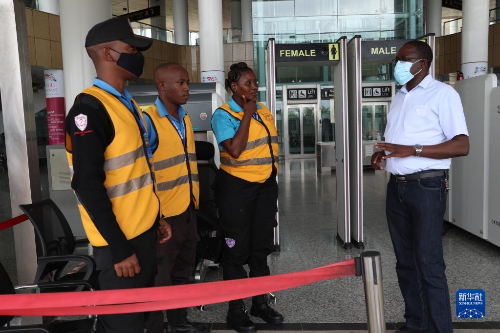 7月27日,肯尼亞蒙內鐵路蒙巴薩終點站站長科斯馬斯(右)在站內與安檢員交談。
