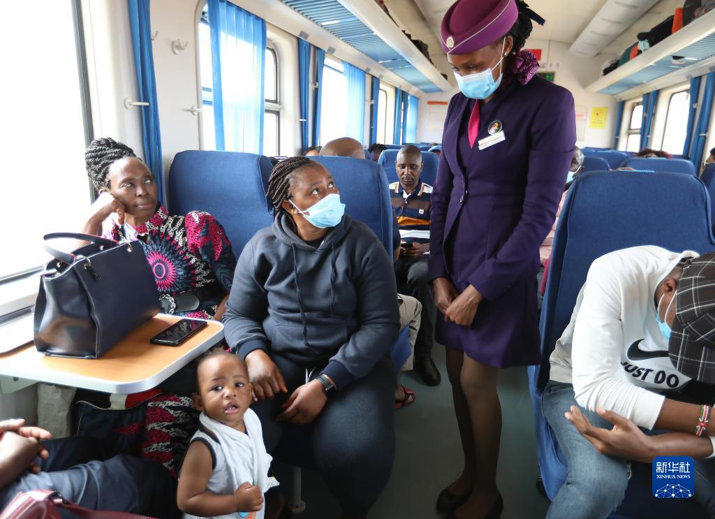 7月29日,列車員菲奧娜(站立者)在蒙內鐵路客運列車上與乘客交流。