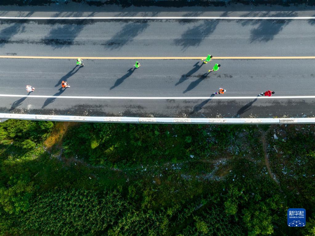 8月7日,運動愛好者在貴州省畢節市百里杜鵑管理區參加山地生態跑活動(無人機照片)。