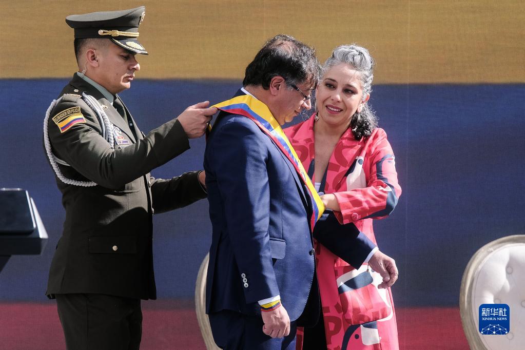 哥倫比亞當選總統古斯塔沃·佩特羅7日在首都波哥大玻利瓦爾廣場宣誓就職。