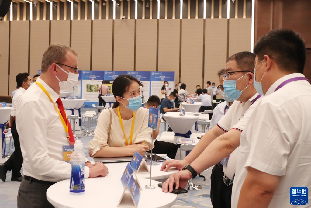 8月8日,參展商代表(前左二)在對接會上向采購商介紹企業產品情況。