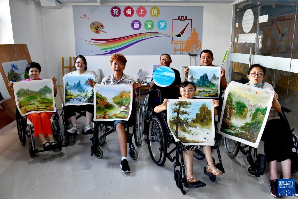 8月7日,在山東省威海市長城愛心大本營,殘疾人學員和指導老師拿著油畫作品合影留念。新華社記者 郭緒雷 攝