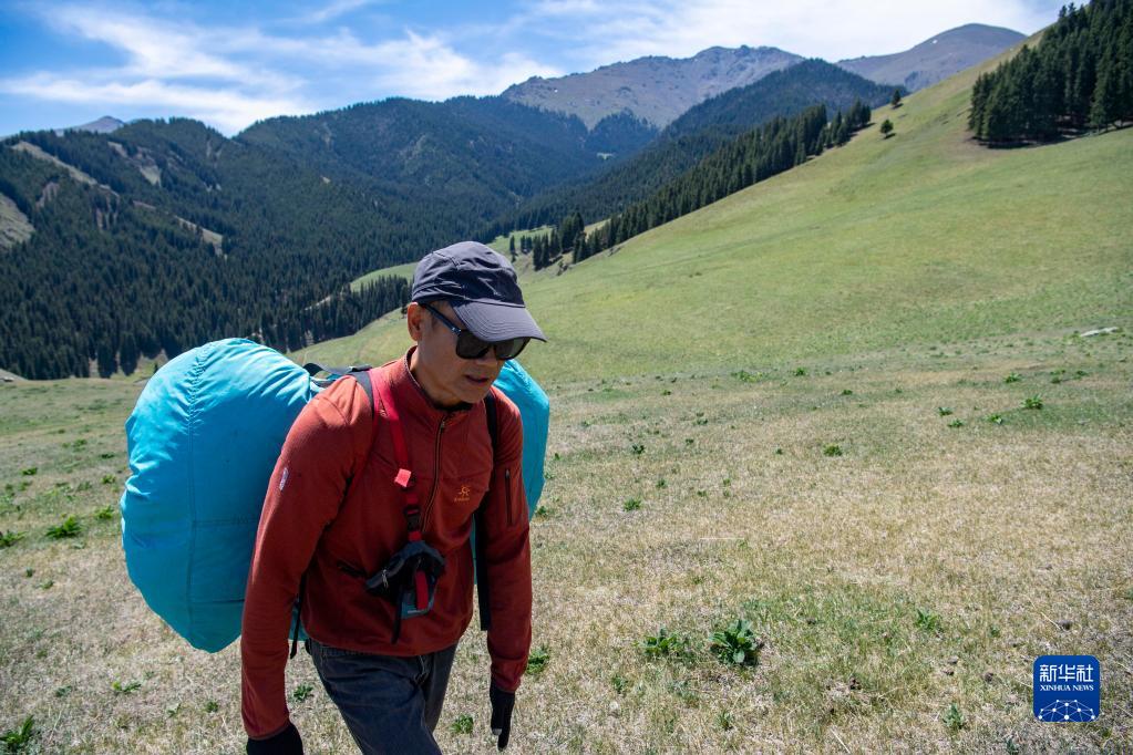 陳瑞峰背著重約20公斤的傘具等裝備向著預定的山頂起飛點行進(5月21日攝)?!⌒氯A社記者 胡虎虎 攝