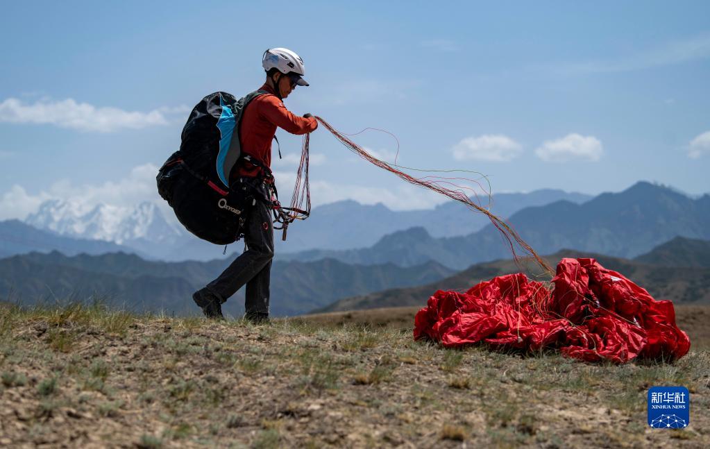 陳瑞峰在烏魯木齊東郊的山間進行飛行訓練(5月24日攝)。身后的天山山脈和博格達雪峰清晰可見。新華社記者 胡虎虎 攝