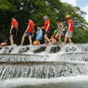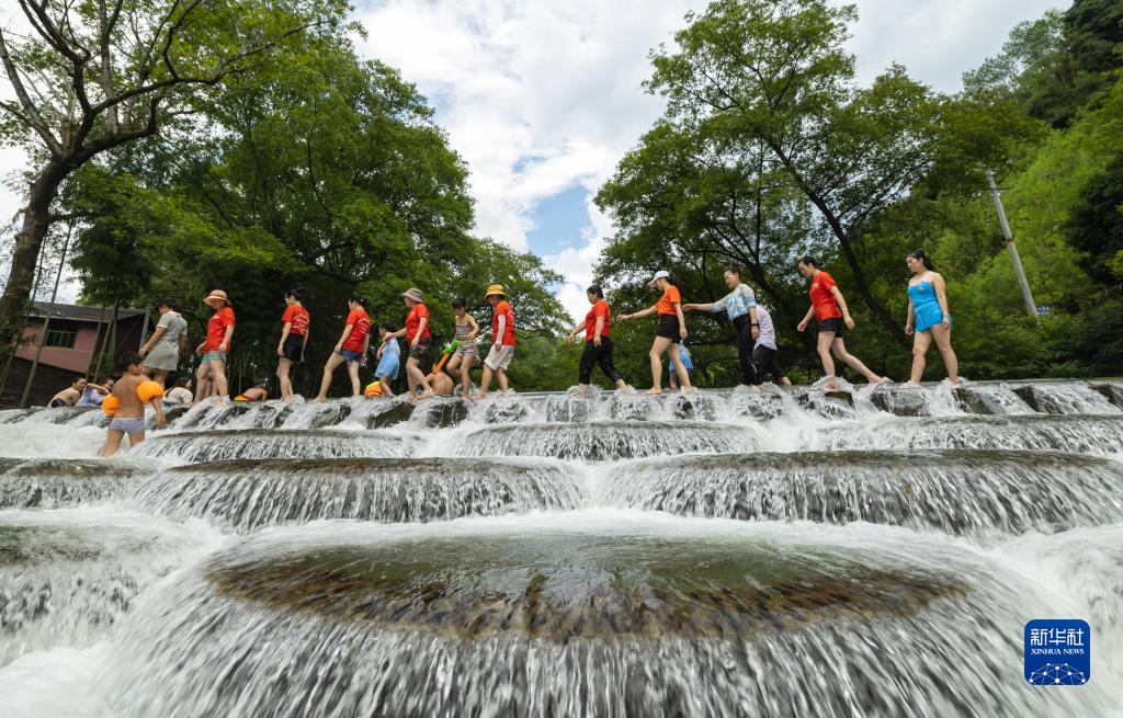 8月8日,湖南省懷化市通道侗族自治縣萬佛山鎮木腳村,人們在壩間戲水。
