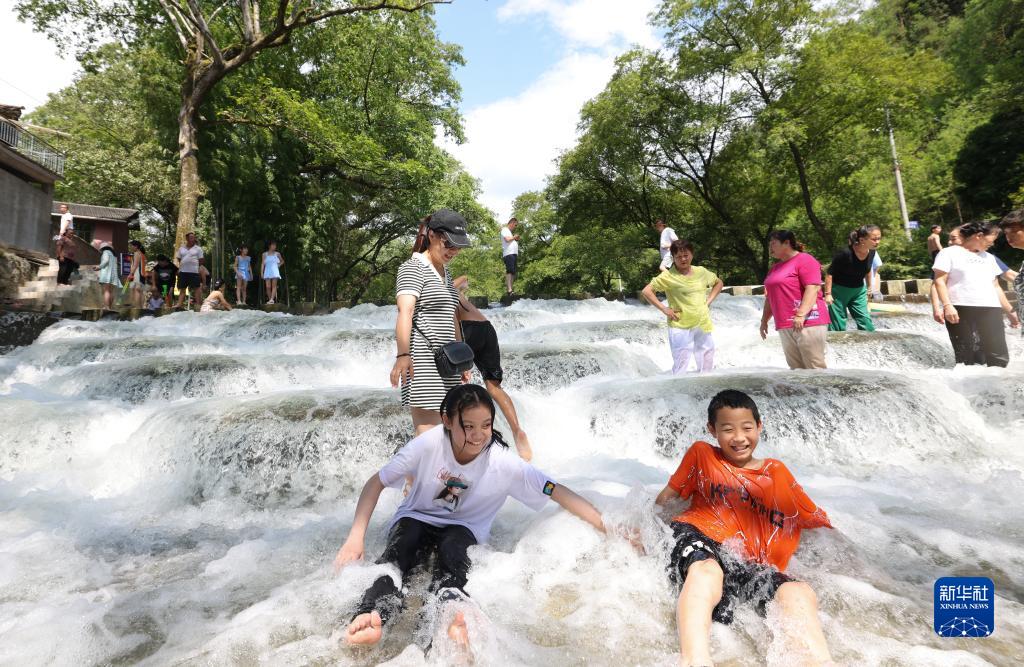 8月8日,湖南省懷化市通道侗族自治縣萬佛山鎮木腳村,人們在壩間戲水。