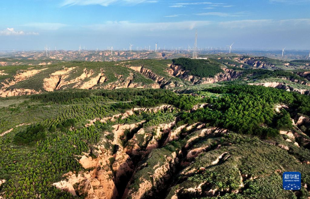 俯瞰神木市馬場梁臥虎寨10萬畝生態林基地(8月3日攝,無人機照片)。該基地南北長54公里,東西寬1至3公里,栽植樹種主要為側柏、油松、樟子松,是神木質量最高、效益最好的生態林基地,林木保存率高達95%以上。