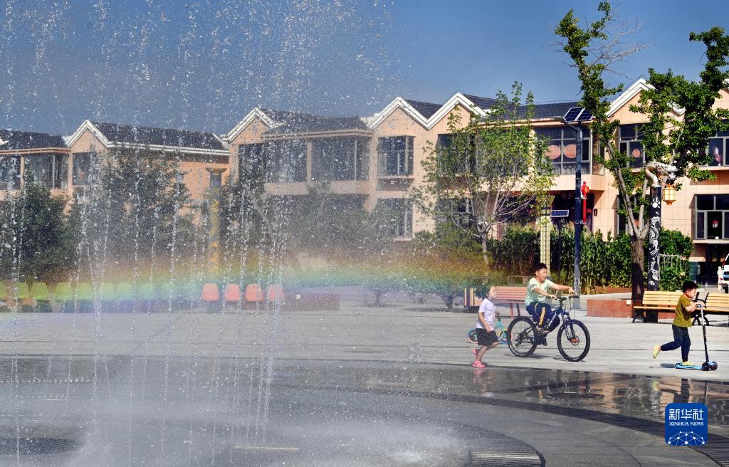 小朋友在神木市西溝街道四卜樹村廣場玩耍(8月5日攝)。多年來,該村累計造林種草2.6萬畝,全村林草覆蓋率達70%以上。村民由五溝八岔的偏僻之地統一搬進設施齊全、功能完善、美麗宜居的現代新型農村社區,這里也成為“國家級美麗宜居村莊示范村”。
