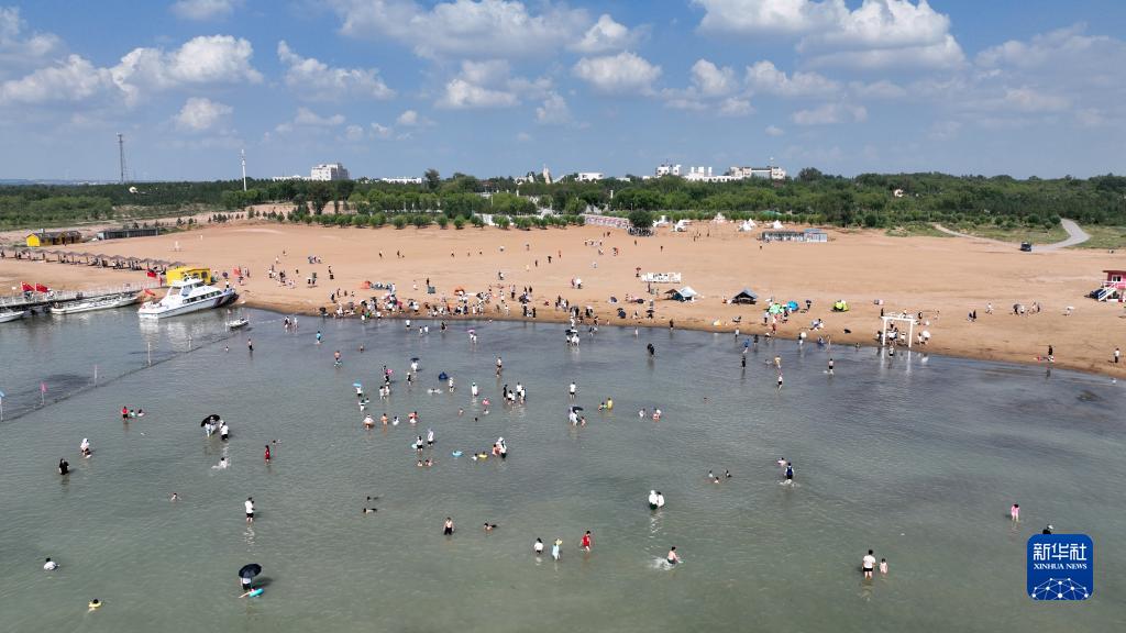 游人在紅堿淖景區休閑(8月5日攝,無人機照片)。紅堿淖環湖四周自然生態良好,環境優雅,是游人休閑度假的好去處。