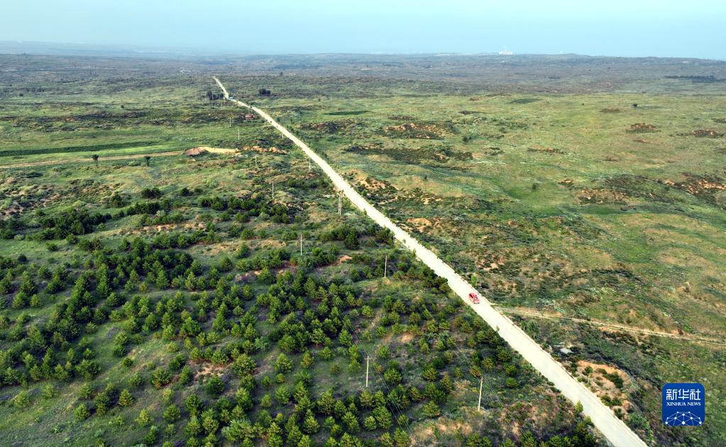 一輛汽車行駛在神木市西沙街道黃家廟村境內的毛烏素沙地道路上(8月2日攝,無人機照片)。神木市境內的沙地已被綠色覆蓋,隨處可見“綠肥黃瘦”景觀。