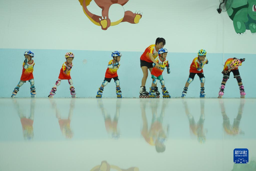 8月8日,小朋友在河北省邢臺市內丘縣一家輪滑俱樂部參加輪滑訓練。