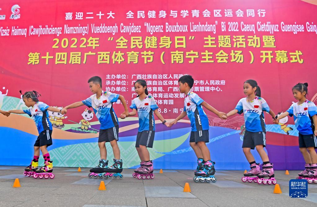 8月8日,全民健身項目展演人員在第十四屆廣西體育節開幕式上表演輪滑。