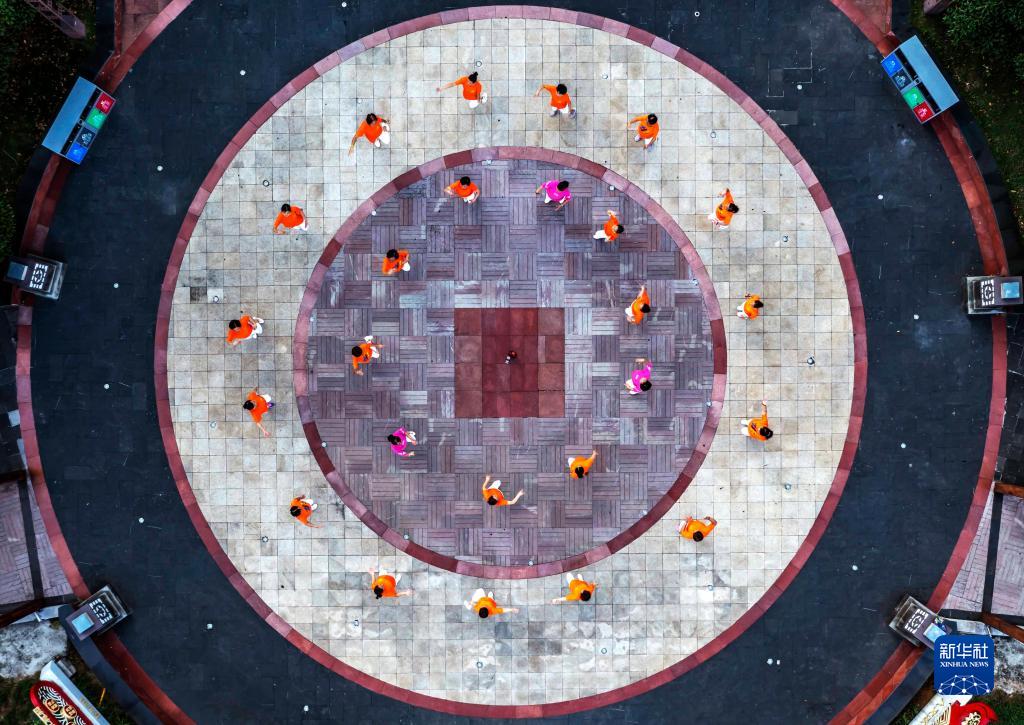 8月8日,市民在貴州省黔西市濱河灣廣場進行健身運動(無人機照片)。