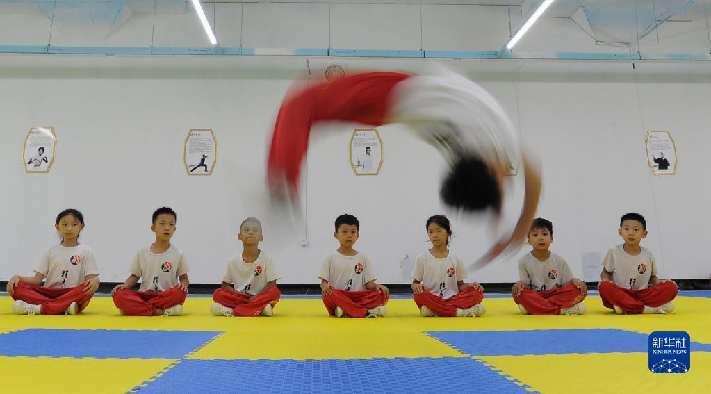 8月8日,小朋友在山東省滕州市一家武術培訓機構訓練。
