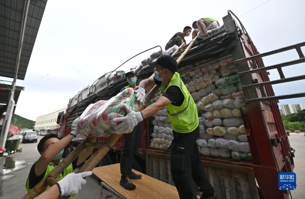 8月8日,在三亞一農副產品批發市場,工作人員在搬運從島外運來的蔬菜。
