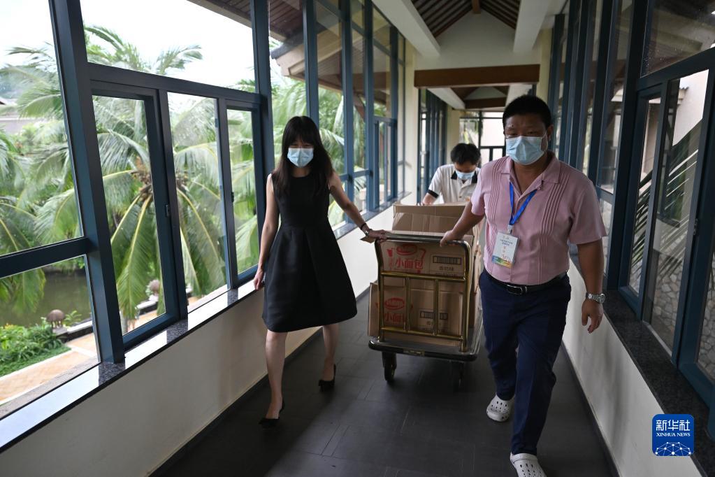 8月8日,三亞亞龍灣一家酒店的工作人員將生活物資送往客房。