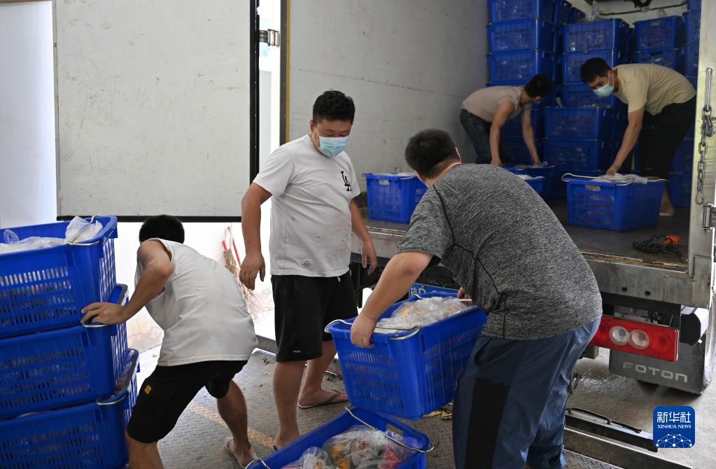 8月8日,工作人員將政府籌措的生活物資裝車,準備送往游客入住的酒店。