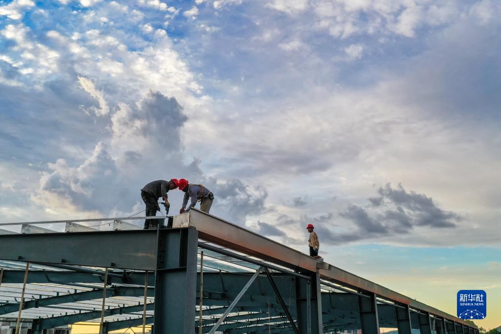 8月7日傍晚,在永州市藍山縣經開區創品國際智慧物流園項目建設現場,工人在施工(無人機照片)。